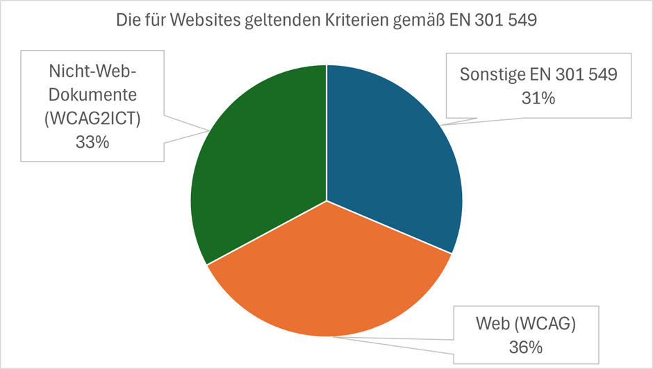 Für Nicht-Webinhalte (z. B. PDF, Word, Excel usw.) gilt Kapitel 10 der Norm, das auf WCAG2ICT basiert, einer Anpassung von WCAG für Nicht-Web-Software und -Dokumente. Dieser Teil macht 33 % der Kriterien der EN 301 549 aus, die für Websites gelten.