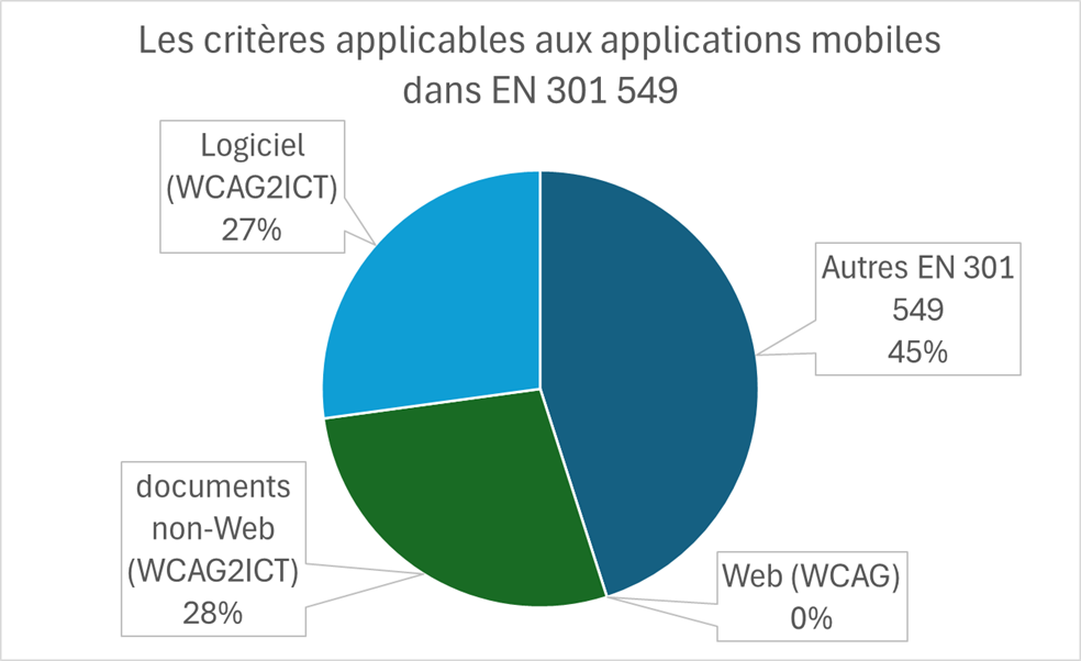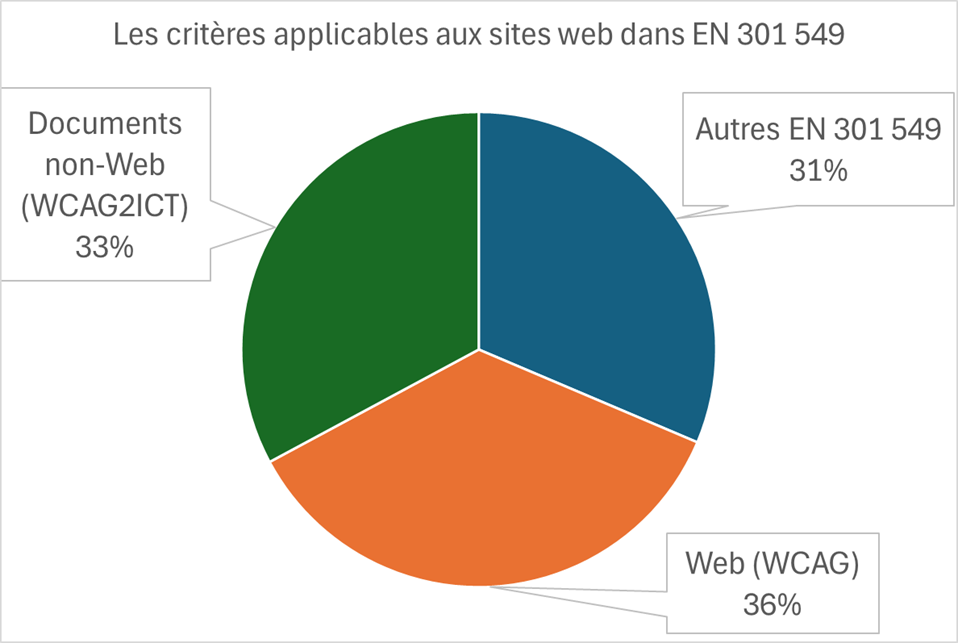 Cependant cette norme européenne va plus loin et tester seulement WCAG ne suffit pas. WCAG est en tant que tel applicable uniquement aux contenus Web et représente 36 % de tous les critères applicables dans EN 301 549.